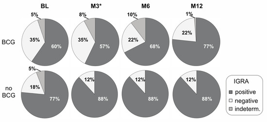Time course comparison of BCG-vaccinated and non-BCG-vaccinated children with confirmed contact of tuberculosis patients for IGRA test results. Blood samples of contacts from tuberculosis index patients classified as either BCG-vaccinated (n = 77) or non-BCG-vaccinated (n = 17) compared for positive, negative, or intermediate IGRA results are shown as pie charts for four timepoints (i.e., BL, M3, M6, M12). The Fisher exact test was applied to analyze significance of differences between the study groups for individual timepoints. A p-value of <0.05 was considered significant and is indicated by *. indeterm., indeterminate.