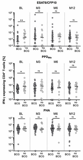 Comparison of M. tuberculosis-specific IFN-γ-positive CD4+ T-cell proportions between BCG-vaccinated and non-BCG-vaccinated children at BL and follow-up timepoints. Proportions of IFN-γ-positive CD4+ T-cells stimulated with M. tuberculosis antigens ESAT6/CFP10, PPDMtb, or PHA are shown as symbol plots. Each circle indicates mean values of duplicate measurements for individual contacts with BCG vaccination (dark gray circles, n = 64) or without (open circles, n = 15). Solid lines indicate the median values for individual groups and timepoints. The Mann–Whitney U-test was applied and a p < 0.05 was considered statistically significant. Asterisks indicate significant differences (* for p < 0.05, ** for p < 0.01). ns, non-significant.