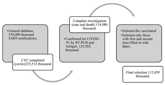 After this filter, we still applied the criteria for vaccinated and unvaccinated against COVID-19, and we selected only the cases with the completion of field 35: Did you receive the COVID-19 vaccine? (yes) or (no), and the unfilled fields were excluded. The next filter was the completion of the 1st and 2nd in field 37 and the vaccine laboratory in field 38, and blank cases were excluded. We considered the complete first and second dose schedule, with the vaccine laboratory and dose date filled in.