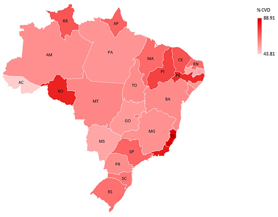 We built two maps with the percentages of CVD and deaths by state of residence of Brazil. We used Microsoft Excel 2019, with the function build graph in the maps model. The software reads by federal unit name and assembles the color map, and, the higher the percentage, the more intense the color. The map also presents a legend on the minimum and maximum in relation to the percentages analyzed by state of the country “(https://support.microsoft.com/pt-br/office/criar-um-gr%C3%A1fico-de-mapas-em-excel-f2cfed55-d622-42cd-8ec9-ec8a358b593b) (accessed on 20 February 2023)”.