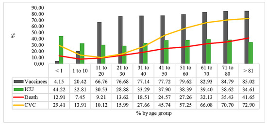 In Figure 5, as well as in Table 4 and Table 5, we show the percentage of vaccinated patients with ICU admission, CVD patients, and deaths. We observed that the age group with the lowest percentage of vaccination against COVID-19 is younger than one year (4.15%), and it was the one that was hospitalized in the ICU (44.42%), with a lethality of (12.91%). Another age group with low vaccination adherence was the 1 to 10 yearsgroup(20.42%), and with ICU hospitalization (32.81%).