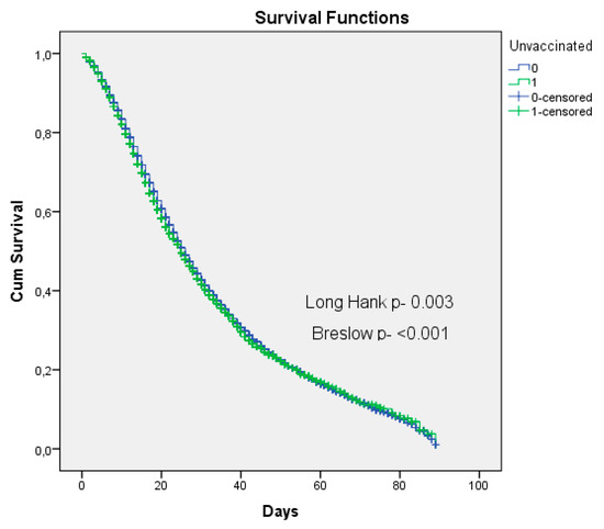 In the survival analysis, we compared two groups with the outcome death, between those vaccinated and those not vaccinated against COVID-19 in hospitalized CVD patients. By the mean number of days of hospitalization until the outcome of cure or death, the unvaccinated patients had a mean of 32 days, and the vaccinated patients’ mean was 33 days. The tests were significant with regards to the log rank (Mantel-Cox)(X2 8.729 p-0.003) and the Breslow (Generalized Wilcoxon) test (X2 12.776 p- < 0.001) tests, confirming differences in length of stay until outcome between groups. Vaccinated patients have longer survival, and non-vaccinated patients have shorter survival (Figure 6).