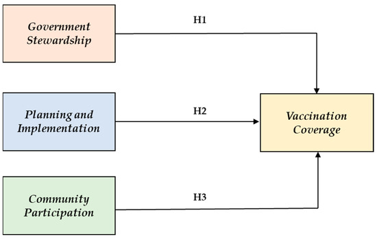 To develop a theoretical foundation for this study, the following hypotheses were developed based on the theoretical background described in the aforementioned subsections. This research hypotheses’ development demonstrates the relationships between the various constructs used in this study. Figure 1 illustrates the structural model designed to validate three research hypotheses evaluating the direct relationship between government stewardship, planning and implementation, and community participation with vaccination coverage.