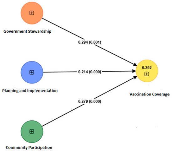 The model also reported 0.064 as the SRMR value, indicating a good model fit. The R-squared value of vaccination coverage obtained from the analysis is 0.294. By and large, all three relationships have β values between 0.2 and 0.3. However, the factors ‘government stewardship’ and ‘community participation’ have a greater impact on vaccination coverage in comparison with ‘planning and implementation’. The reported β values H1 and H3 are 0.294 and 0.279, respectively. In the comparison of both relationships, it is observed that the impact of government stewardship is highest, followed by community participation and planning and implementation. The reported β value for the relationship between planning and implementation and vaccination coverage is 0.214, which is the least among the three proposed hypotheses.