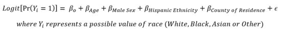 To examine uptake of ≥1 dose of a COVID-19 vaccine by race groups in the region, given it has an even further reduced percentage of missing race values in vaccination records, multiple imputation was performed. For this imputation, both multinomial logistic regression and a machine-learning random forest algorithm were used to confirm the robustness of the values generated. Both imputation methods utilized a probabilistic approach by which probabilities of being White, Black, Asian or Other race were calculated for the remaining records with missing race values []. These probabilities were generated through regression-based approaches using an individual’s known ethnicity, age, sex and county of geographic residence as predictors of each respective individual’s probability of being White, Black, Asian or Other race (Figure 1). These probabilities were then summed across each respective race group, along with the number of individuals vaccinated with known race values. To examine if any unidentified gaps in COVID-19 vaccine uptake were prevalent by race, the percent of individuals vaccinated with ≥1 dose by race group after imputation was compared to that of the complete case analysis.