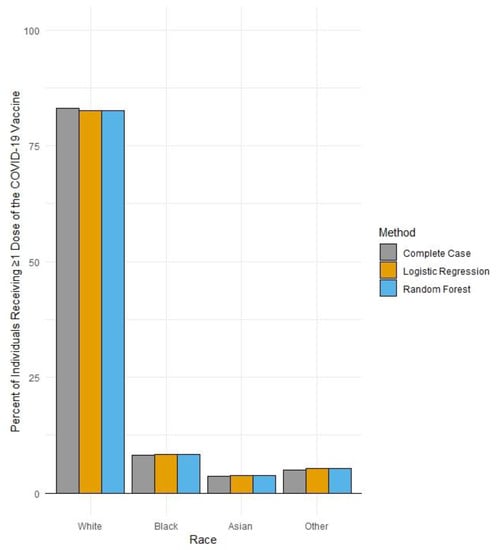 Future work for the COVID-19 vaccine campaign should further explore possible drivers of lower uptake among these populations to avoid excess burden of vaccine-preventable illness. Continued and accurate examination of the extent to which disparate uptake of the COVID-19 vaccine is prevalent is critical for evaluating the impacts of social determinants such as structural racism, and the impact that such factors have on lack of engagement with preventative care []. Given the continual protection of the COVID-19 vaccines against severe COVID-19 outcomes such as hospitalization and mortality, equity in vaccine uptake and engagement across all demographic groups is critical [,,]. Additionally, continual efforts should be made to reduce the percentage of records with missing race values in state vaccination registries, when appropriate, to (1) avoid biased effect estimates used to inform vaccination campaigns aimed at addressing equitable uptake, and (2) to improve precision surrounding these estimates by increasing the usable sample size. Similar imputation efforts in the future should consider the prioritization of techniques assigning probabilities of race values, as compared to deterministic approaches to assigning race values, in order to respect the choices of individuals to not choose a race by which to list within their vaccination records. Finally, future efforts are warranted to identify potential reasons for missing race within vaccination records in order to limit the prevalence of missing demographic information within vaccination records, as well as to characterize those individuals most likely to not report race, to improve the accuracy of imputation work.