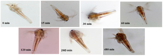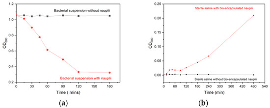 The maximum uptake of bacterin by artemia over a period of incubation was optimized by incubating the artemia at a density of 100 nauplii mL−1 in a 6-well plate containing 107 CFU mL−1 bacterin suspension. Bacterin suspension and nauplii in sterile saltwater separately were used as controls. Each treatment was executed in duplicate. The bacterin was coated in Tryphan blue dye (0.4%) to facilitate the microscopic observation of ingestion by artemia. The uptake of bacterin in artemia gut was observed in a light microscope at different time intervals such as 0, 15, 30, 45, 60, 90, 120 and 180 min, respectively. The absorbance of the suspension at OD600 at the same intervals of time was measured, respectively [12].