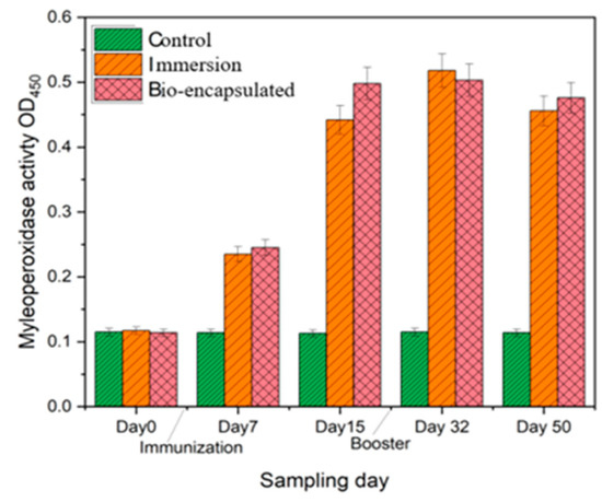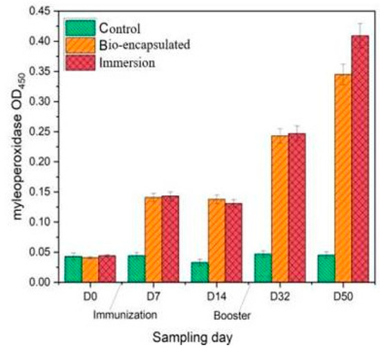 Myeloperoxidase (MPO), an immunological component of innate immune responses, is released from the phagocyte cytoplasmic granules that can contribute to oxidative responses against pathogenic invasion. The serum and intestinal tissue peroxidase levels were considerably (p ≤ 0.05) increased in the bio-encapsulated group from day 7 to day 14 experimental group fishes, and it was increased by a booster dosage at day 32. A similar study showed a significant increase in serum myeloperoxidase at an early infection in P. sarana following an intra-peritoneal challenge with A. hydrophila [32]. Thus, the higher peroxidase activity observed in bio-encapsulated and immersion groups not only portrays the stimulatory effect of bacterial factors on neutrophilic granulocytes, i.e., the inducible nature of peroxidases, but also indicates the role of the peroxidase–hydrogen peroxide system in the elimination of pathogenic factors.
