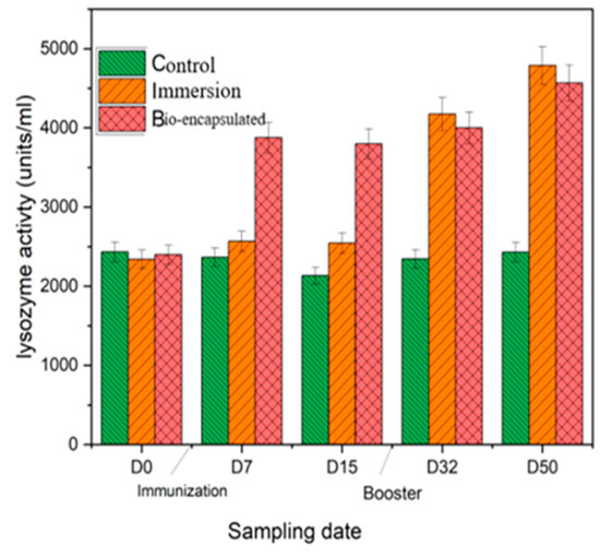 The serum lysozyme activity of Cyprinus carpio L. showed enhanced activity of 3985 mg/mL at day 7 in the bio-encapsulated group that was stable over days 15, 32 and 50 with a booster dose at day 30. Increased lysozyme activity was seen at day 50 by 4560 mg/mL and was not significantly different to the immersion group, which showed higher activity than both groups. Both the immunization groups were significantly different from the control group. The booster dose enhanced the lysozyme activity among the immersion group after day 32 (Figure 5).