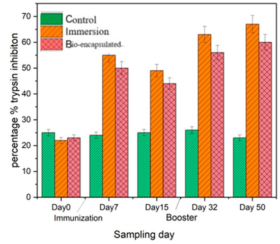 The serum antiprotease activity measured as the percentage inhibition of trypsin activity in the control group was 25% over 2 weeks post-experiment. However, the percentage of inhibition in the immersion group was recorded at around 68%, which was not significantly different from the bio-encapsulated group, which showed 55% inhibition of trypsin on day 7 post-vaccination and around 49% on day 14. This activity was enhanced over day 32 and day 50, followed by a booster dose. On the other hand, significantly high inhibition (p ≤ 0.05) was observed in the groups immunized by immersion and bio-encapsulation than in the control group (Figure 7).