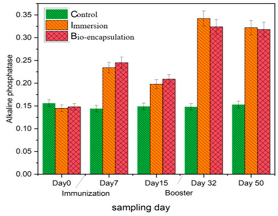 Alkaline phosphatase (AKP) activity in the intestinal tissues of both immunization groups showed a significant increase by day 7 in comparison to the control group. In the bio-encapsulated group, the level of alkaline phosphatase was increased gradually after day 7 and was not significantly different to that of the immersion group. The AKP level of both immunized groups decreased by day 14, which increased by day 32 and day 50 with a booster dose and is not significantly different from each other. The highest AKP level was seen by day 32 with an OD value of 0.342 (±0.05) in the immersion group (Figure 9).