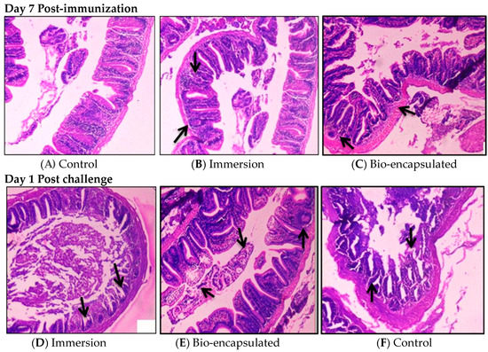 Photomicrographs of the hindgut at 7 days post-experiment and 1-day post-challenge were recorded in all groups. Gut-associated lymphoid tissues (GALT) were observed in both immersion and bio-encapsulation groups. The induction of lymphoid cell aggregation in the lamina propria of immersion and bio-encapsulation groups was observed around one week post-immunization. No structures of GALT were developed in the lamina propria of the control group (H&E × 100). Post-challenge histological analysis of tissue samples was also carried out. Immersion and bio-encapsulation groups were seen with macrophages and lymphoid cells clustered over the villi and the villi length was seen as normal. Additionally, a normal arrangement of the mucosal epithelium (ME), submucosa (SM), muscularis (MM) and serosa was observed. Control group fishes showed epithelial necrosis with sloughed necrotic debris in their lumen and slight distortion in the microvilli structure (Figure 11).