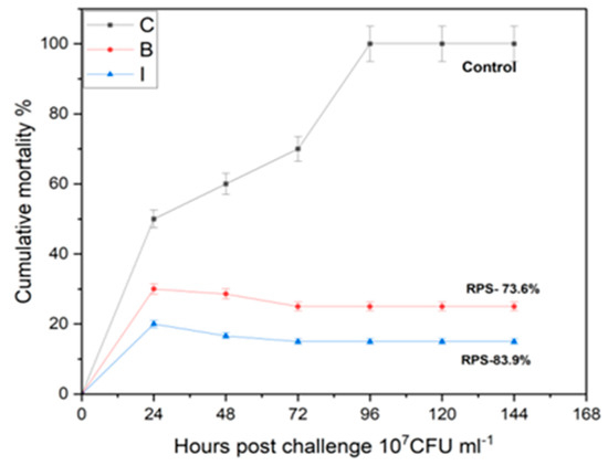 The mortality and relative percent survival analysis for evaluating the protection showed that the cumulative mortality index (CMI) in the bio-encapsulated group was much lower than the control group but lesser in comparison to the immersion route of immunization. After an intraperitoneal challenge, the bio-encapsulated group showed a decreased cumulative mortality index (CMI) than the control group, which ensures protection in common carp. With continuous booster dosage, it also showed stable protection in comparison to the immersion group. These results were in relation to the previous studies with artemia bio-encapsulated vaccination of juvenile carp of 15, 29 and 58 days old with a Vibrio anguillarum bacterin [8]. The RPS analysis in the present work showed that in treated fish, protection was at an RPS of 73% and 84% in both bio-encapsulated and immersion routes, respectively. Similar results were obtained in an analysis with lumpfish orally immunized as larvae and then both orally and i.p. boosted as juveniles that showed a significant RPS (76.5%) to the V. anguillarum i.p. challenge [31]. This suggests that the orally administered bio-encapsulated immunization confers protection to the fish by minimizing handling stress and can be aided with an enhanced booster dose for stronger protection. The re-isolation of A. hydrophila from the surviving fishes after 4 weeks of challenge also showed the absence of bacteria in the immunized group.