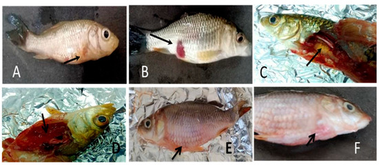 Symptoms post-challenge in fish prior to mortality (A,E,F) External hemorrhage, Reddened fins, Iridial hemorrhage, (E) Swollen abdomen, Detachment of Scales (B) Open bloody sores/ulcers, exophthalmia. (D) Internal hemorrhage/Ulcerative necrosis (C) Friable liver, and congested kidney with serous fluid.