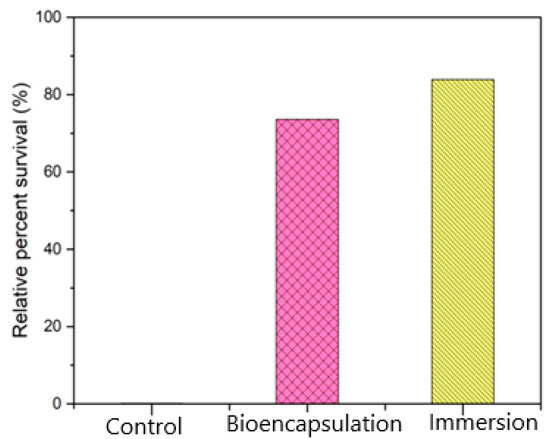Relative Percent Survival (RPS) of all three groups (Control, Immersion & Bio-encapsulation) post-challenge.