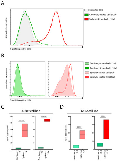 The S-protein was detectable on the cell surface of both cell lines, as shown in Figure 1A–D, following treatment with both vaccines. Interestingly, a higher percentage of Jurkat cells exhibited cell surface S-protein expression compared with the K562 cells, as shown in Figure 1C,D.