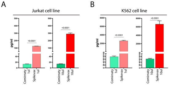 ELISA SARS-CoV-2 Spike protein detection following treatment of cell lines with mRNA-based COVID-19 vaccines. Panel (A) (Jurkat cell line) and panel (B) (K562 cell line) show the amount (pg/mL) of free S-protein in the supernatant of 1 µL (left) and 10 µL (right) Comirnaty-treated and Spikevax-treated cells, respectively. The mean ± SD is shown in the column bar graphs. Significant differences in S-protein detection between Comirnaty- and Spikevax-treated samples were assessed using the unpaired t-test and p-values are shown.