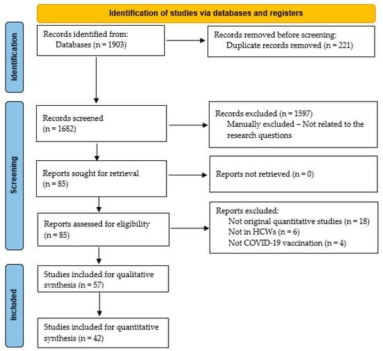 After conducting systematic searches in PubMed, CINAHL, Web of Science, Scopus, and Embase, we retrieved 1903 articles. After duplicate removal (221 results), 1682 articles were retrieved for title and abstract screening. Our screening resulted in a collection of 85 articles. After applying the inclusion/exclusion criteria, we excluded 28 articles for specific reasons (Figure 2). Finally, 57 cross-sectional studies with 77,466 participants were included in this systematic review, while 42 were selected for the quantitative synthesis of evidence. The main findings of the 16 articles not considered for meta-analysis are discussed in the third section.