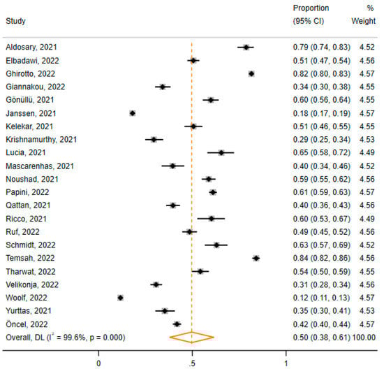 Results of the meta-analysis. The pooled proportion (orange rhombus) of HCWs’ acceptance of mandatory COVID-19 vaccines for the general population was 50% (95% CI: 38%, 61%) [28,29,30,31,32,33,34,35,36,37,38,39,40,41,42,43,44,45,46,47,48,49].