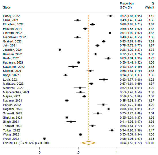 Again, due to the observed heterogeneity between the individual studies, only the random effects model was performed (I2 = 99.6%, Cochrane Q test p-value = 0.000). The estimated pooled proportion was 64% (95% CI: 55%, 72%) (Figure 5).