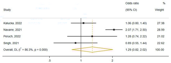 In our third approach to subgroup analysis, we sought to explore the effect of occupational status on acceptance of COVID-19 vaccine mandates. Only four studies reported stratified data in relation to the outcome “HCWs’ acceptance of COVID-19 vaccine mandates for HCWs”. Thus, only one subgroup analysis was performed, yielding an odds ratio of 1.29 (95% CI: 0.82, 2.02) (Figure 7). Although physicians appeared to have 29% increased odds of accepting the COVID-19 vaccine for HCWs compared to other HCWs, this relationship was insignificant in our model.