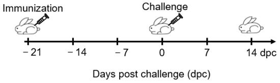 To test immune correlation, the rabbits were randomly divided into experimental (immunized) and DMEM (diluent control) groups. We divided 24 rabbits into three groups of nine rabbits each, and vaccinated them with BoHV-4/GMD, BoHV-4/SLY and DMEM at a dose of 1.52 × 109 TCID50 via intramuscular (IM) injection. Rabbits were monitored for 21 days. Blood samples were collected at 0, 7, 14, 21 dpi for analysis of antibody responses by ELISA. Rabbits are susceptible to SS2 infection and the pathology of rabbits experimentally infected with SS2 via the IP route is similar to that observed in pigs [38]. Immune-associated rabbits were challenged intraperitoneally with 5.96 × 106 colony forming units (CFUs) of SS2 ZY05719 strain at 21 days post-immunization (dpi) and monitored at least daily over 14 days for symptomology and scored accordingly as shown in Figure 1. The rectal temperature of each animal was measured at −21, −14, −7, 0, 2, 4, 7, 9, 11, 12, and 14 dpc. The rabbits exhibited extreme lethargy and were regarded as terminally moribund, and humanely euthanized in accordance with the Guidelines on the Humane Treatment of Laboratory Animals (Ministry of Science and Technology of the People’s Republic of China, Policy No. 2006 398).
