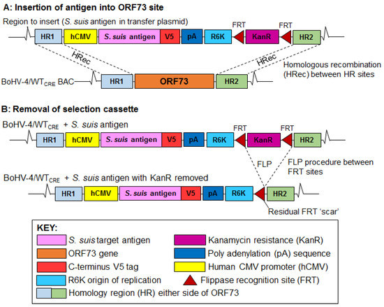 The strategy for constructing recombinant BoHV-4/GMD and BoHV-4/SLY BACs expressing S. suis antigens is shown in Figure 1. A wild-type (WT) BAC of BoHV-4 (BoHV-4/WT BAC) generated from a BoHV-4 V. test strain [31] was re-engineered to contain a Cre recombinase within the BAC cassette [33]. This resulted in the creation of a recombinant BAC (BoHV-4/WTCRE) with the capacity for BAC cassette self-excision following introduction into MDBK cells during virus reconstitution. Genes encoding GMD [16] and SLY (GenBank No. KC405589.1) S. suis proteins were codon-optimized for expression in swine (Sus scrofa) and chemically synthesized (GeneArt, Thermo Fisher Scientific, UK) as plasmids and grown in Top10 E. coli (Invitrogen™, Thermo Fisher Scientific, UK), cultured in LB broth with carbicillin (100 μg/mL final concentration). The synthetic genes were ligated into a transfer plasmid (pMiniOri), which contained an expression cassette consisting of the human CMV promoter (hCMV), R6K origin of replication (R6K), and a kanamycin resistance marker (KanR) flanked by FLP recombinase recognition target (FRT) sites (Figure 1). The transfer plasmid also contained homology regions (HRs) flanking the ORF73 gene of BoHV-4 required for insertion of GMD and SLY expression cassettes within the BoHV-4/WTCRE BAC. The recombinant transfer plasmids were grown in PirI E. coli (Invitrogen™, Thermo Fisher Scientific, UK) cultured in LB broth with kanamycin (50 μg/mL final concentration). Following linearization of the transfer plasmids by restriction enzyme digestion, GMD or SLY expression cassettes were recombined into the BoHV-4/WTCRE BAC to replace the ORF73 gene by using homologous recombination [34] in EL250 E. coli, cultured in LB broth with chloramphenicol and kanamycin (17.5 μg/mL and 25 μg/mL final concentration, respectively). This resulted in the creation of recombinant BoHV-4 BAC clones BoHV-4/GMD and BoHV-4/SLY. The FRT-flanked KanR cassette was removed from BoHV-4/GMD and BoHV-4/SLY BACs by arabinose-induced expression of FLP recombinase [35]. Recombinant BACs were initially screened by restriction fragment length polymorphism (RFLP) analysis following digestion of BAC DNA with selected individual restriction enzymes (SpeI, XbaI, BamHI, XmaI, HindIII) depending on predicted band patterns. A single enzyme was used prior to KanR removal and BACs were confirmed by digestion using three separate enzymes post KanR removal (Figure S1). Expected digest patterns were predicted by MacVector™ Inc software (Cambridge, UK) in comparison to the WT BoHV-4 BAC. After digestion for four hours at 37 °C, samples were separated on a 1% agarose gel electrophoresis, and visualized under UV light.