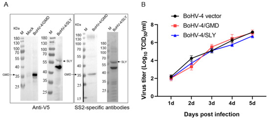 BoHV-4/GMD and BoHV-4/SLY viruses were reconstituted by transfection into MDBK cells using PolyJet™ DNA In Vitro Transfection Reagent (SignaGen, Rockville, MD, USA) according to the manufacturer’s recommendations, with an additional 30 min centrifugation step at 310× g prior to incubation. Cells were then cultured at 37 °C with 5% CO2 and monitored for cytopathic effect (CPE) for 14 days. Supernatant from cells with full CPE was collected and stored at −80 °C. Reconstituted viruses were then passaged in MDBK cells for five passages, and expression of V5-tagged GMD and SLY were confirmed at each passage by Western immunoblot. DNA encoding GMD and SLY was amplified by PCR from passage 5 (p5) viruses and sequenced to confirm presence of S. suis target genes. Complete genome integrity of p5 viruses was confirmed by NGS. Virus titers were measured in MDBK cells using a 50% tissue culture infective dose (TCID50) assay [36].