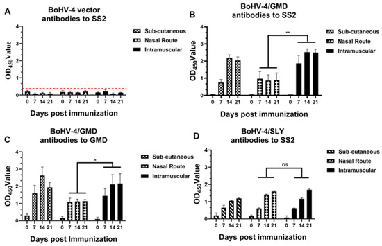 Analysis of antibody response in rabbits immunized BoHV-4/GMD via different administration routes. Rabbits (n = 3) were immunized with BoHV-4/GMD or BoHV-4 WT viruses via IM, SC, and IN routes. Blood samples were collected at 0, 7, 14, and 21 dpi for detection of antibodies against SS2 and GMD. (A) Antibody response against SS2 in rabbits immunized with BoHV-4 vector. (B) Antibody response against SS2 in rabbits immunized with BoHV-4/GMD. (C) Antibody response against GMD in rabbits immunized with BoHV-4/GMD. (D) Antibody response against SS2 in rabbits immunized with BoHV-4/SLY. Red dotted line indicates the cut-off value for negative. *, p < 0.05; **, p < 0.01 examined by paired Student’s t-test between groups. ns, no significant difference between groups tested by paired Student’s t-test.