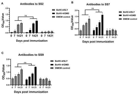 Analysis of antibody response specific to SS2, SS7, and SS9 in immunized rabbits. Rabbits (n = 8) were immunized with BoHV-4/SLY via IM route. One rabbit in the BoHV-4/GMD group (n = 7) died due to human error in blood collection. Blood samples were collected at 0, 7, 14, and 21 dpi for detection of antibodies against SS2, SS7, and SS9 by ELISA. (A) Levels of antibody against SS2. (B) Levels of antibody against SS7. (C) Levels of antibody against SS9. Red dotted line indicates the cut-off value for negative. ns, no significant difference between groups tested by paired Student’s t-test.
