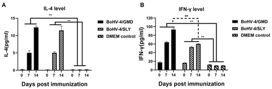 IFN-γ and IL-4 are used as indicators of Th1- and Th2-type immune responses, respectively [43,45,46,47], with both types of response being thought to be important for S. suis control [6]. We therefore analyzed IFN-γ and IL-4 production in the rabbits immunized with BoHV-4/GMD and BoHV-4/SLY vaccines. Both BoHV-4/GMD and BoHV-4/SLY groups displayed a significantly higher level of IFN-γ and IL-4 production compared to DMEM controls (Figure 6). The levels of IL-4 were similar between rabbits receiving BoHV-4/GMD and BoHV-4/SLY (Figure 6A) at all time points, but IFN-γ levels increased to significantly higher levels in BoHV-4/GMD- compared to BoHV-4/SLY-immunized animals by 14 dpi (Figure 6B).