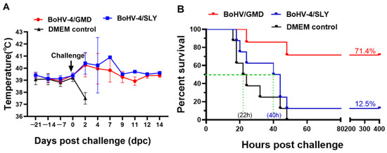 Analysis of protective efficacy of BoHV-4/GMD and BoHV-4/SLY against SS2 challenge in rabbits. Rabbits were immunized with BoHV-4/GMD (n = 7) or BoHV-4/SLY (n = 8) via IM route and challenged at 21 days post-immunization. The rabbits were monitored daily for an additional 14 days. (A) Changes in rectal temperature. (B) Survival analysis of rabbits after challenge.
