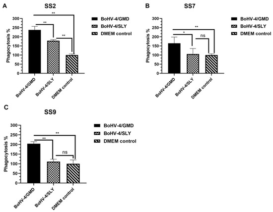 Analysis of antibody-mediated phagocytic activity against SS2, SS7, and SS9. Sera were collected from rabbits immunized with BoHV-4/GMD (n = 8) or BoHV-4/SLY (n = 8) at 21 dpi and incubated with FITC-labeled SS2, SS7, and SS9, respectively. The opsonized bacteria were subsequently incubated with PAMs from naïve rabbits. Fluorescence intensities representing the phagocytized bacteria were measured at 485 nm excitation/535 nm emission. Phagocytotic activity was calculated as follows: percentage phagocytosis (% of DMEM control) = (fluorescence intensity of immunized rabbits/fluorescence intensity of DMEM control rabbits) × 100. (A) Phagocytic activity against SS2. (B) Phagocytic activity against SS7. (C) Phagocytic activity against SS9. Red dotted line indicates the cut off value for negative. ns, no significant difference between groups tested by the paired Student’s t-test. *, p < 0.05; **, p < 0.01 tested by Student’s t-test between groups.