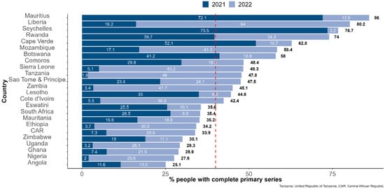 Proportion of people who had completed the primary COVID-19 vaccination series by country in the African region at the end of December 2021 and 2022.