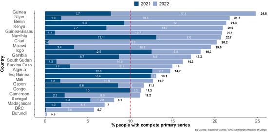 The following countries recorded the highest percentages of the people who had completed the primary series during 2022: Liberia (64.0%), United Republic of Tanzania (46.0%), Sierra Leone (43.2%), Zambia (41.7%), Mozambique (41.3%), Cote d’Ivoire (36.9%), and Ethiopia (30.5%). Vaccination coverage stagnated in 2022 in Algeria, Burundi, Equatorial Guinea, Congo, Senegal, and Gabon with 3% or fewer people completing the primary series during the year 2022 (Figure 3 and Figure 4).