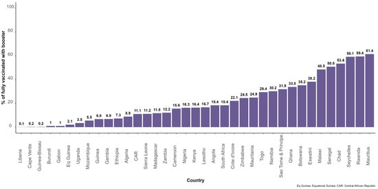 Proportion of people with who had completed the COVID-19 vaccination primary series and received booster doses in 35 countries in the African region.