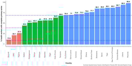 Percentage of health workers who had completed the primary COVID-19 vaccination series in 24 countries in the African region. Note: The dashed blue lines highlight the 10%, 40% and 70% of people having completed the primary series marks.