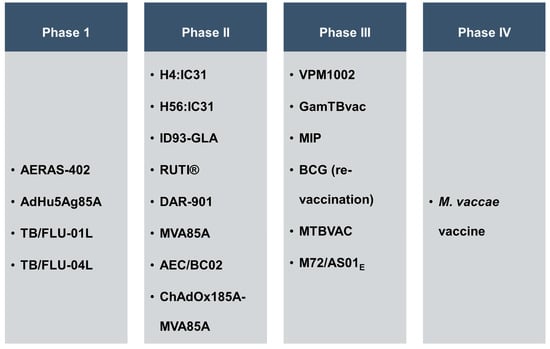 - Cobelens, F.; Suri, R.K.; Helinski, M.; Makanga, M.; Weinberg, A.L.; Schaffmeister, B.; Deege, F.; Hatherill, M. TB Vaccine Roadmap Stakeholder Group. Accelerating research and development of new vaccines against tuberculosis: A global roadmap. Lancet Infect. Dis. 2022, 22, e108–e120. [Google Scholar] [CrossRef] [PubMed]