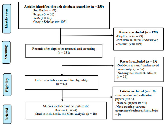 The PRISMA diagram (Figure 1) illustrates the selection process and shows the reasons for exclusion. A total of 259 articles were identified from the initial search, and 131 remained after removing duplicates and title screening. On further screening, 42 articles remained for eligibility assessment after excluding those which were not original studies and not done in slum/underserved communities. The final assessment yielded 24 articles for further analysis [25,26,27,28,29,30,31,32,33,34,35,36,37,38,39,40,41,42,43,44,45,46,47,48].