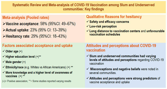 The review showed that although 58% of residents of slum and underserved communities were willing to take up the COVID-19 vaccine, only 23% had actually received the vaccine. The observed uptake rate in this study is much lower than the current global vaccination rate of 69% [5], which is probably due to the various structural barriers to vaccine access in slums and underserved communities [9]. Moreover, although results indicated an increase in acceptance rates since the vaccine rollout, hesitancy in these less advantaged communities (29%) is still substantially high, although similar to previous studies elsewhere [21]. Notably, the highest vaccine hesitancy was reported in underserved communities of the USA (45%), which is similar and consistent with findings of previous reviews [9,11,21].
