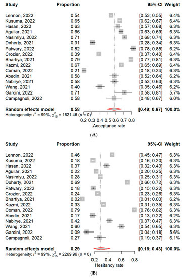 Sensitivity analyses by considering only studies done before and after the median year (six studies) showed lower acceptance (56%, 95% CI: 41–70%) and hesitancy (27%, 95% CI: 9–59%) rates, both with high heterogeneity (both I2 = 99%, p < 0.01). In addition, considering only studies with good quality (14 studies, after removing two studies [38,40]) gave higher acceptance (59%, 95% CI: 51–67%) and hesitancy (31%, 95% CI: 22–40%) rates, both with significant heterogeneity (both I2 = 99%, p < 0.01).