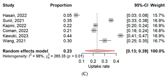 Sensitivity analyses by considering only vaccine uptake studies done before and after the median year (three studies) showed a higher uptake rate of 37% (95% CI: 29–45%), with significant heterogeneity (I2 = 93%, p < 0.01). However, considering only studies with good quality (four studies, after removing two studies [29,40]) gave a slightly lower uptake rate of 21% (95% CI: 8–45%), also with significantly high heterogeneity (I2 = 99%, p < 0.01).