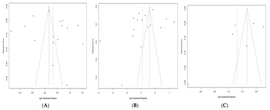 Funnel plots of (A) Acceptance studies (Egger’s test, p = 0.504), (B) Hesitancy studies (Egger’s test, p = 0.209) and (C) Uptake studies (Egger’s test, p = 0.291).