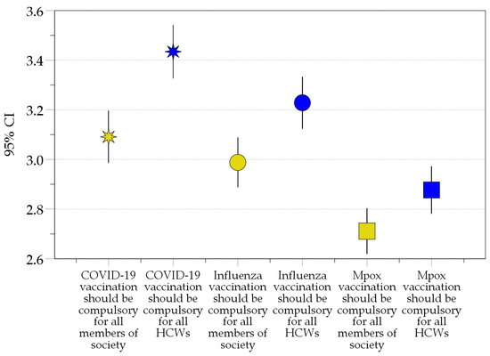 The role of HCWs’ knowledge and awareness cannot be overstated in the response to emerging infections’ threats [38]. This issue was of particular relevance during the 2022 Mpox outbreak, considering the previous and recent evidence suggesting the presence of noticeable knowledge gaps regarding Mpox among HCWs in various world regions [39,40,41,42,43,44]. Additionally, Mpox emerged in close proximity in time to the outbreak of COVID-19 and the associated circulation of misinformation and conspiratorial ideas regarding emerging infections, which were feared even before the emergence of COVID-19 [45,46,47]. Furthermore, the dynamic nature of vaccine hesitancy requires the continuous assessment of its scope and determinants [17]. This is particularly important among health professionals, considering their influential role in establishing community trust regarding vaccination [22,48,49]. Additionally, HCWs can have a primary role in community education and help to alleviate anxiety and fear that arise in response to emerging infections [50,51,52,53,54]. Therefore, the ongoing Mpox outbreak can provide an opportunity to study vaccination readiness, serving as a model enabling an understanding of the factors that might hinder vaccine acceptance for an emerging virus infection [1,55]. Furthermore, evidence continues to emerge indicating that the acceptance of Mpox vaccination is low among health professionals [56,57]. Thus, the study of the intention to get vaccinated among health professionals can help in the identification of underlying factors that may be targeted for proper control of the ongoing Mpox outbreak and for immediate response to future outbreaks.
