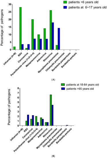 The proportions of various respiratory tract pathogens that caused pneumonia in patients aged <18 years are shown in Figure 1A. Among patients aged <6 years, the most common respiratory tract pathogen was RSV, followed by rhinovirus, parainfluenza virus (1 + 2 + 3 + 4), adenovirus, metapneumovirus, M. pneumoniae, influenza A, and coronavirus. The dominant respiratory tract pathogens (according to percentage) were RSV (28%), rhinovirus (26%), adenovirus (14%), metapneumovirus (10%), parainfluenza virus type 3 (9%), parainfluenza virus type 4 (6%), parainfluenza virus type 1 (5%), M. pneumoniae, influenza A (2%), and coronavirus (1%). Among patients aged 6–17 years, the most common respiratory tract pathogens were rhinovirus, followed by M. pneumoniae, parainfluenza virus, adenovirus, and metapneumovirus (equal proportions), and then RSV and coronavirus (equal proportions). The major respiratory tract pathogens (according to percentage) were rhinovirus (17.9%), M. pneumoniae (14.3%), metapneumovirus (7.1%), adenovirus (7.1%), coronavirus (3.6%), RSV (3.6%), parainfluenza virus type 2 (3.6%), and parainfluenza virus type 4 (3.6%).