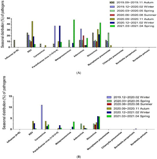 (A). The seasonal distribution of pathogens in pneumonia during the COVID-19 pandemic among patients below age 18; the common viral pathogen in spring was metapneumovirus, in summer was adenovirus, in autumn was RSV, and in winter was parainfluenza virus. (B). The seasonal distribution of pathogens in pneumonia during the COVID-19 pandemic among patients above age 18; the common viral pathogen in spring and summer was rhinovirus, in autumn was coronavirus and RSV, and in winter was coronavirus followed by rhinovirus.