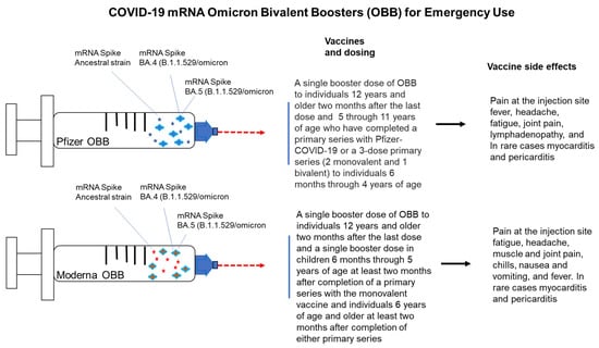 The emergence of more contagious variants of COVID-19 that can escape detection by our immune system warranted the development of a booster that can confer protection against these variants [16]. The Omicron variant and its subvariants can infect even individuals who have been vaccinated and boosted with monovalent vaccines. Due to the emergence of the omicron BA.4 and BA.5 variants, the FDA recommended that vaccines against the BA.4/BA.5 variants be developed [17,18]. In June 2022, the FDA requested that both Pfizer and Moderna develop a bivalent vaccine consisting of equal amounts of mRNAs that encode the spike protein from the ancestral SARS-CoV-2 strain as well as the spike protein from the Omicron BA.4/BA.5 subvariants [19] (Figure 1). It is important to note that BA.4 and BA.5 subvariants do not differ in their spike proteins or their receptor-binding domains (RBDs), but instead differ in other viral proteins [20]. The updated COVID-19 boosters would retain the ability to neutralize the ancestral viral strain and provide a more robust immune response against the circulating Omicron subvariants. These updated boosters would have the potential to neutralize future variants and extend the duration of immune protection [19]. The FDA authorized the Pfizer and Moderna OBBs on 31 August 2022 [21]. These boosters contain equal amounts of mRNAs encoding the ancestral strain spike protein and the spike proteins from the BA.4 and BA.5 strains of Omicron variant (Figure 1). These boosters were authorized for emergency use as a single dose to be given at least two months after a primary or booster vaccination [21]. On 1 September 2022, the bivalent boosters from Pfizer and Moderna replaced the monovalent boosters for individuals aged 12 years and above in the US and in other countries [22]. Guidance for dosing and potential side effects of these boosters were also presented in Figure 1.