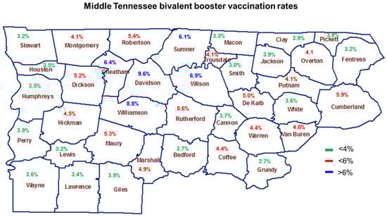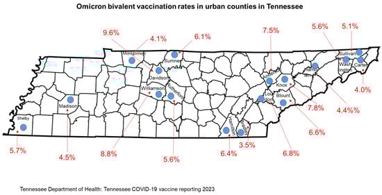 Bivalent booster vaccination rates per 100,000 persons in urban counties in Tennessee. Tennessee Department of Health: Tennessee COVID-19 vaccine reporting https://www.tn.gov/health/cedep/ncov/covid-19-vaccine.html (accessed on 6 February 2023).