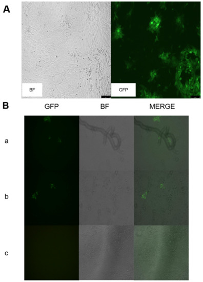 The 121 gene and the sequence of the left and right homologous arms of recombinant rGS14ΔCBPΔGIF were determined. The 121 gene was successfully replaced with the GFP gene. After four rounds of purification, all the cytopathic areas of the virus emitted green fluorescence (Figure 2A), which indicated all of the 121 genes were successfully replaced with the GFP gene. After further continuous purification, no green fluorescence was observed in the lesioned areas under fluorescence microscopy (Figure 2B). Sequencing results showed no mutation in the rest of the virus, except for the missing part of the gene (see supplementary Figure S1 for partial results graphs).