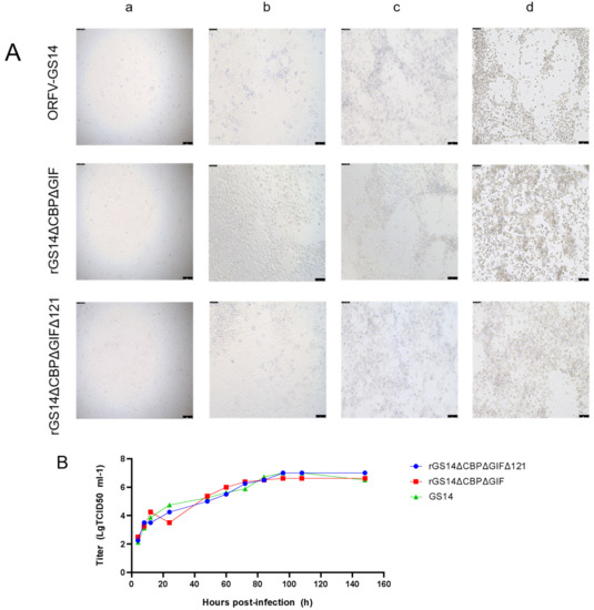 Comparison of in vitro growth curves and in vitro lesion morphology of parental strain ORFV-GS14, rGS14ΔCBPΔGIF and rGS14ΔCBPΔGIFΔ121: (A) In vitro CPE at different time points after infection with ORFV-GS14, rGS14ΔCBPΔGIF and rGS14ΔCBPΔGIFΔ121. The magnification of the microscope is 100×; (a) 24 h post-infection (b): 48 h post-infection (c): 72 h post-infection (d): 96h post-infection. (B) In vitro CPE of rGS14ΔCBPΔGIFΔ121, rGS14ΔCBPΔGIF and GS14 single-step growth curves in PGT cells (MOI = 1). (C) The number of viral infections at different time points after infection of rGS14ΔCBPΔGIFΔ121, rGS14ΔCBPΔGIF and GS14 in PGT cells. Calculations were based on qPCR detection of viral load at different time points.
